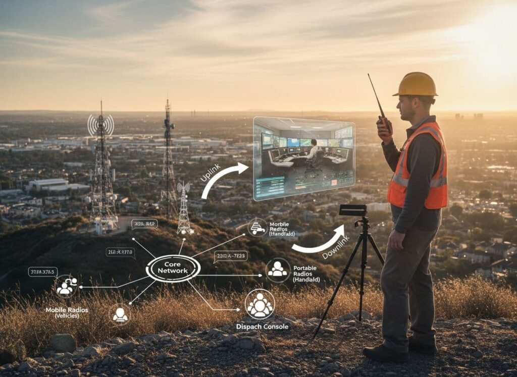 Une représentation photoréaliste d’un système de radiocommunication mobile terrestre (LMR) en fonctionnement réel, illustrant les communications entre les stations de base, les unités mobiles et les centres de répartition, avec un éclairage cinématographique professionnel et des détails hyperréalistes.
